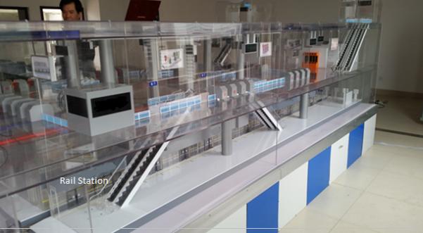 Taking a miniaturized model as a platform, station operation simulation training system in rail transit including monitoring and control of HVAC large scale system, mini system, AC water system, tunnel ventilation, platform shield door, escalator, firefighting equipment, lighting equipment, environmental control equipment and electromechanical equipment.